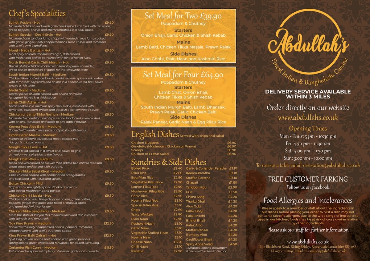 Located at 600 Blackburn Rd, Accrington, Abdullah's offers a vibrant fusion of flavors that will delight any palate. The menu is designed to ensure a memorable dining experience, featuring set meals that are perfect for sharing. For just £36.90, their Set Meal for Two boasts an indulgent array of starters, including Onion Bhaji and Shish Kebab, paired with robust mains like Lamb Balti and Chicken Tikka Masala. Larger parties can enjoy the Set Meal for Four, which serves up exquisite dishes such as South Indian Murgh Balti and Lamb Dhansak.